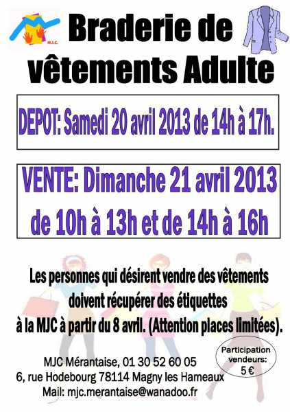 Le dépôt des vêtements aura lieu le samedi 20 avril  de 14h  à 17h.